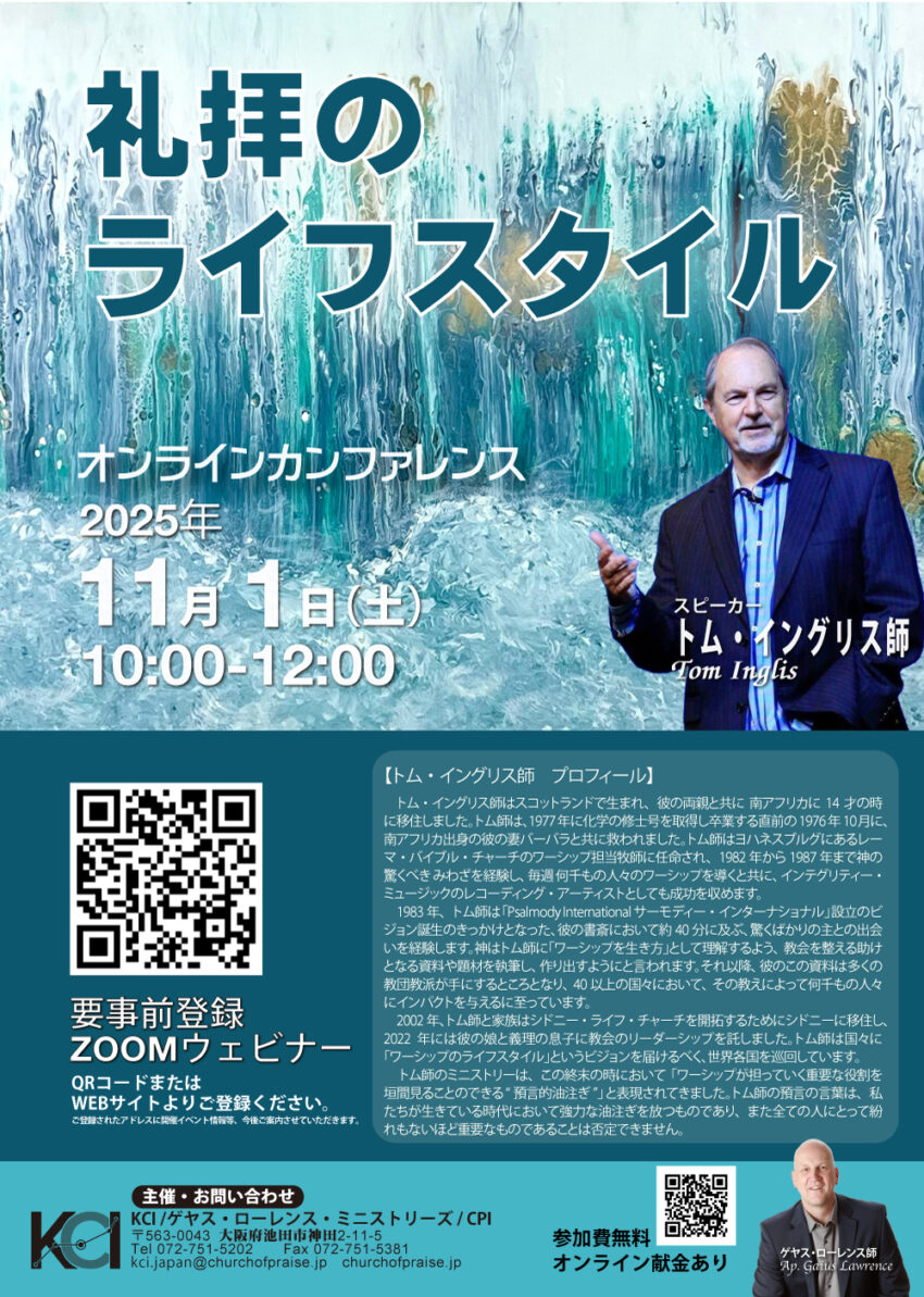 2025.10.15【全国】オンラインカンファレンス【全国】オンラインカンファレンス 礼拝のライフスタイル講師:トム・イングリス 師 日時:11月 1日(土) 10:00~12:00どなたでも自由にご参加いただけます。参加費無料!オンライン自由献金!Zoomウェビナーで実施します。 ご覧いただくには、Zoomのウェビナーに事前登録が必要です。事前登録 LINE note 【大阪】仮庵の祭り & CPI 2...【大阪・沖縄】プレイズ&ワーシップ...