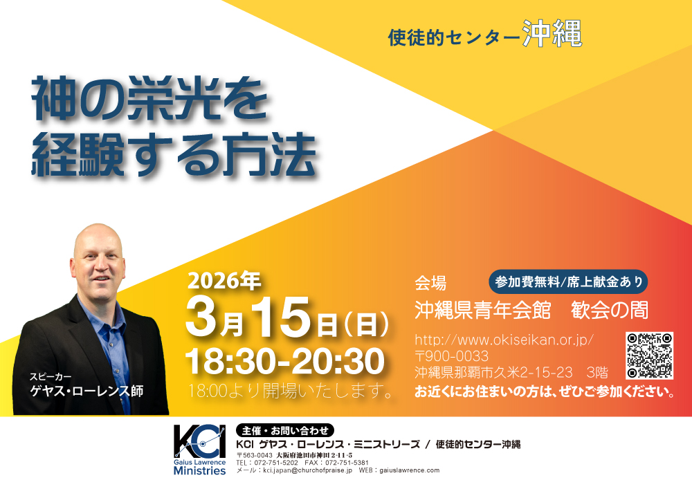 2026.02.16【沖縄】神の栄光を経験する方法神の栄光を経験する方法講師:ゲヤス・ローレンス 師日時:3月15日(日)18:30-20:30場所:沖縄県青年会館 歓会の間(3階)住所:〒900-0033 沖縄県那覇市久米2-15-23参加費無料/席上献金あり LINE note 【AC東京】信仰の7つのレベル